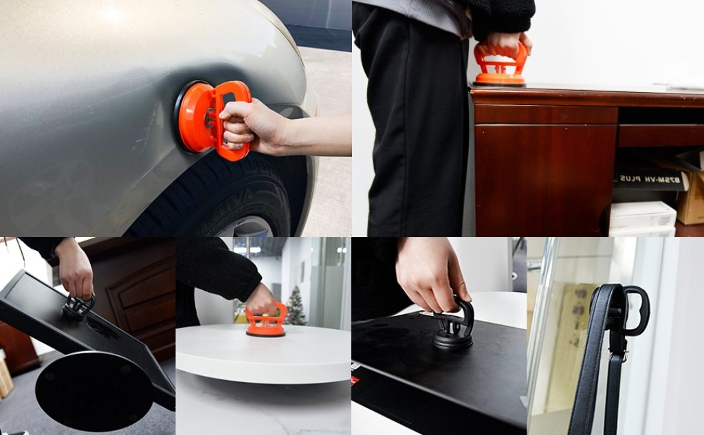 - The heavy-duty dent puller is manufactured from durable plastic and thick rubber suction cups, which can produce greater suction. This is an ideal suction cup for car dents and objects lifting or moving.