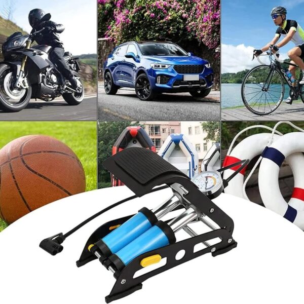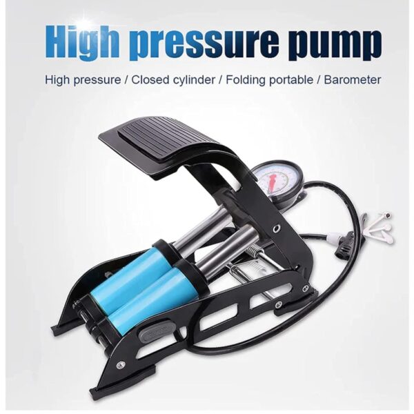 Double Cylinder Portable Foot Pump Air Tyre Inflator with Pressure Gauge for Car Tyres, Bicycle, Bike, Motorcycle Tyres, Balls, Air Bike floor pumps are designed with a sturdy base, it provides stable support for faster inflation. You only need to step on the pedal to set your desired pressure. Road bicycles Foot Pump is a perfect item for various types of tires and all inflatables. Easy to use and provide up to 120 PSI pressure reach to your different needs.